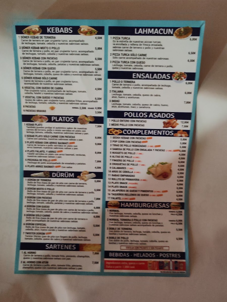 - Kebabs: Choose from the classic Döner Kebab Ternera featuring succulent beef or the Döner Kebab Mixto o Pollo, a mix of tender chicken, enveloped in a crisp Turkish bread. Both are generously garnished with fresh lettuce, tomatoes, onions, and signature sauces, priced at just €4.50 and €5.00 respectively.